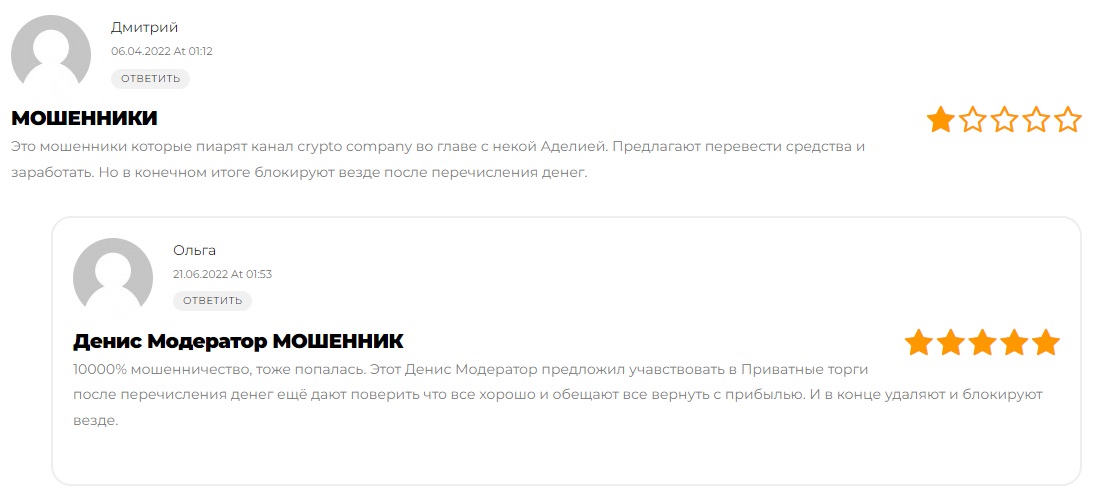 Сотрудничество с Денисом Модератором и его каналом — рисковое дело, ведь трейдер не приводит никакой статистики, не доказывает эффективность торгов и использует любой способ для обмана. Дополнительным фактором, свидетельствующем о мошенничестве, является продвижение других аферистов и отсутствие какой-либо информации о себе. С учетом сказанного вывод один: использовать сигналы автора канала “Цифровое золото” и инвестировать в специальных группах не рекомендуется.