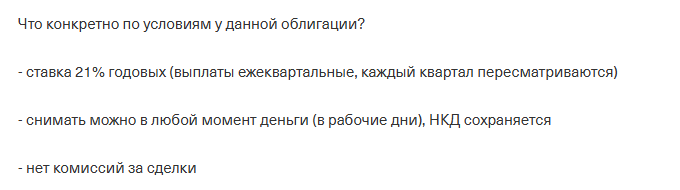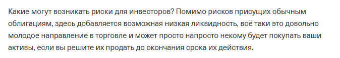 Пользователь честно предупреждает о потенциально низкой ликвидности ЦФА, так как об активе мало кто знает. Возможно, такие облигации больше подойдут инвесторам со среднесрочными или долгосрочными стратегиями заработка.