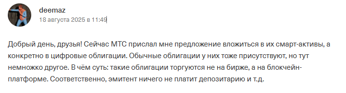 По словам юзера, представители «МТС» прислали ему предложить купить их ЦФА. Главные особенности цифровых облигаций от «МТС» – это внебиржевой оборот, использование блокчейна и неизвестный рейтинг их надежности. Эмитент таким образом получает контроль над ценными бумагами и не платит депозитарию.