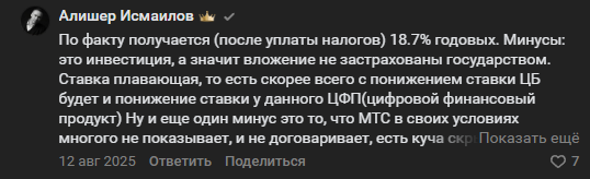 У Алишера Исмаилова также отрицательное отношение к ЦФА от «МТС». Он указывает на отсутствие страховки вкладов государством, плавающие ставки.