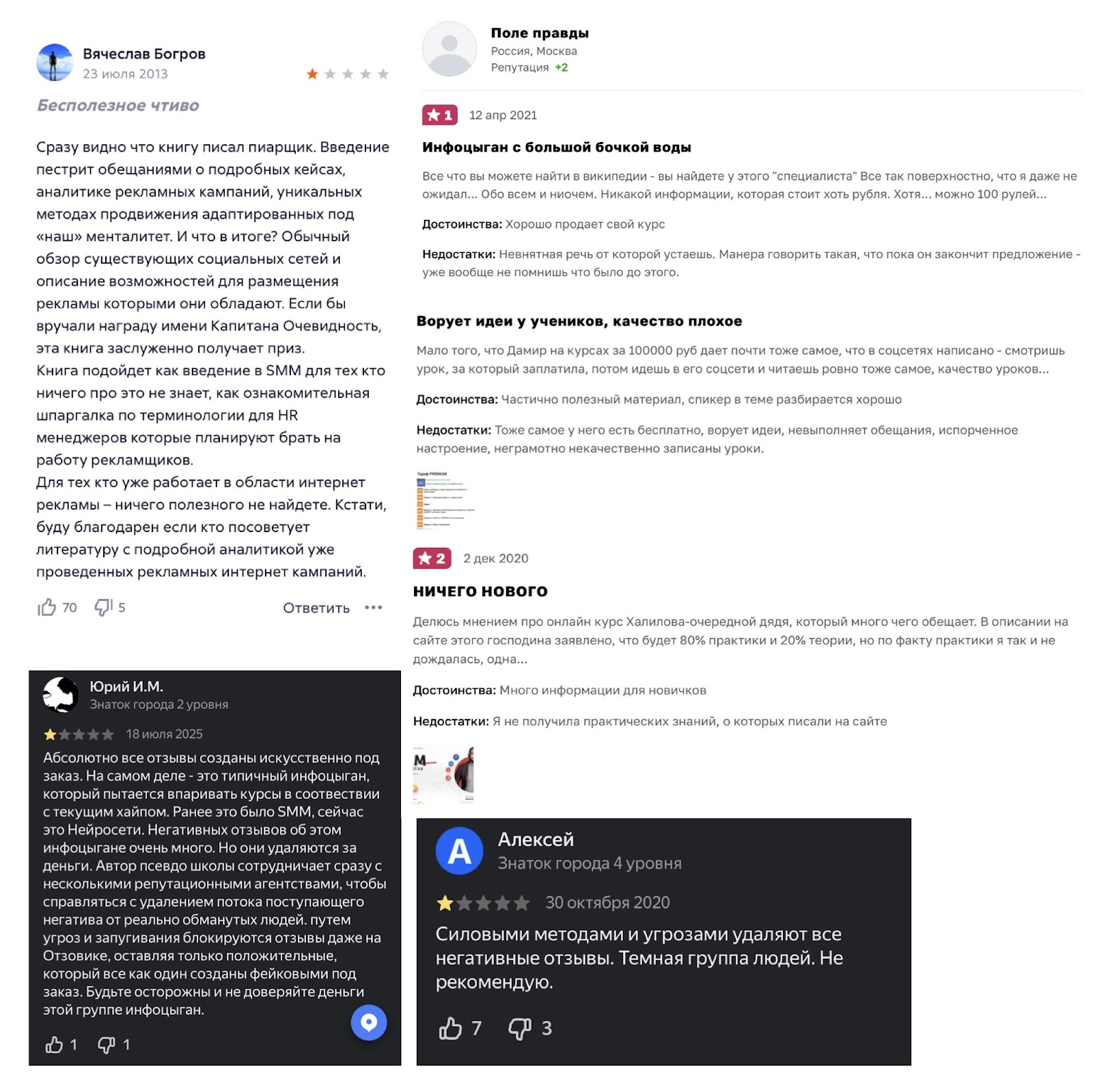 Те, кто не доволен приобретенным продуктом, говорят о неинформативности курса, а также утверждают, что все сказанное можно найти в свободном доступе. Книги автора тоже не вызывают восторга у аудитории.