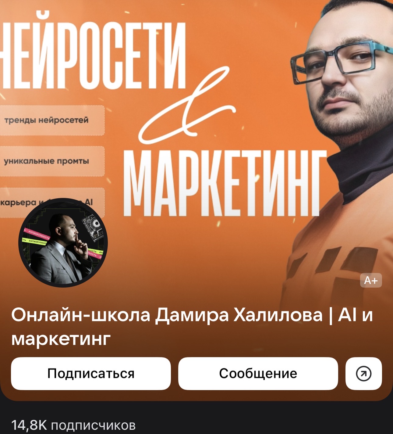 Продукты онлайн школы Дамира Халилова представлены на странице ВК @ Smmdamir. Это коммерческий профиль, посвященный заработку в сфере маркетинга с помощью нейросетей.