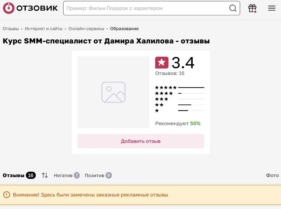 Обратите также внимание на пометку о заказных отзывах, которую оставили модераторы рейтингового сайта.