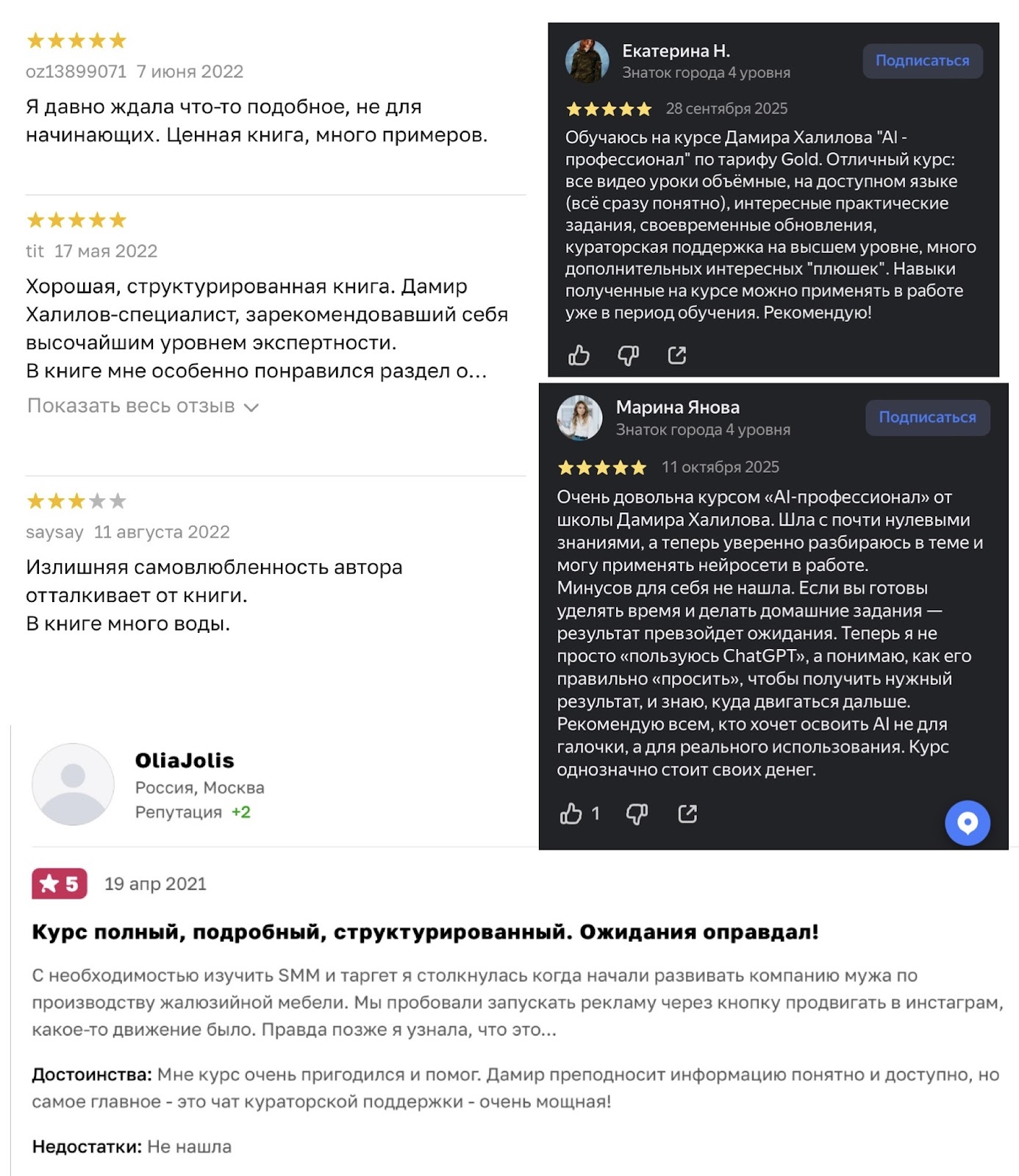 Отзывы о курсах Дамира Халилова довольно разнообразные. До ознакомления с положительным фидбеком обратите внимание, в каком стиле он написан. Комментарии напоминают причесанное литературное произведение, а не публикацию обычного человека.