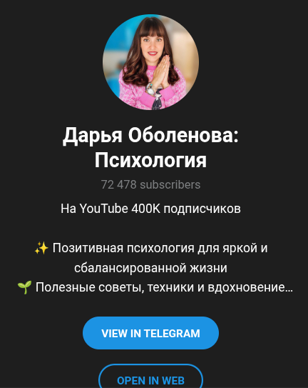 Наша редакция не советует читать телеграм, ютуб и группу в ВК Дарьи Оболеновой, а также использовать практики на желание, продажу квартиры или криптовалюты, на быстрые деньги, чтобы выиграть в лотерею, так как это не поможет. В худшем случае автор образовательной платформы попытается продать дополнительные курсы, не имеющие ценности.