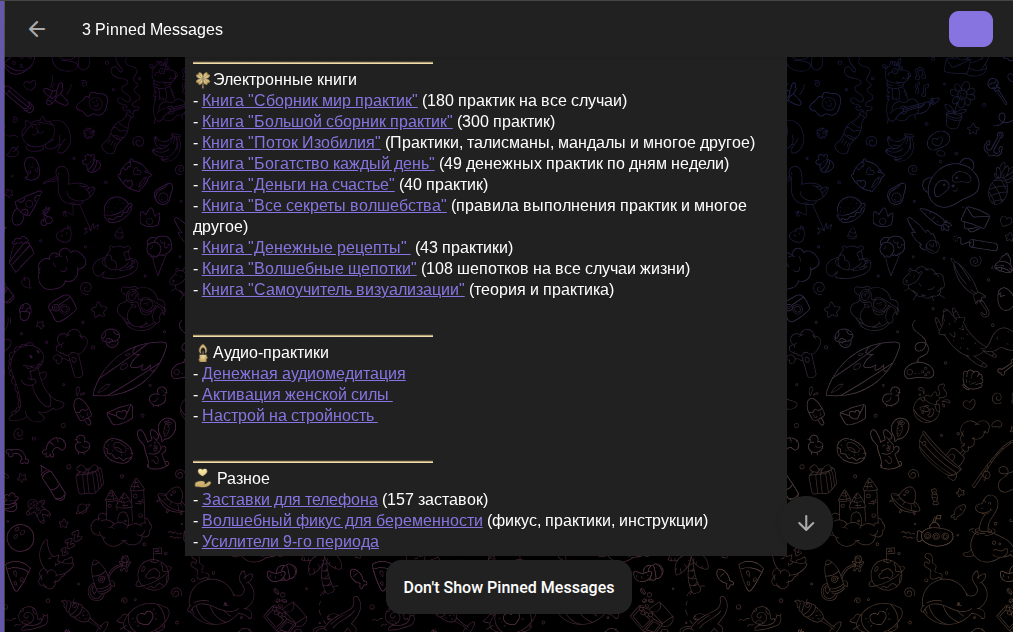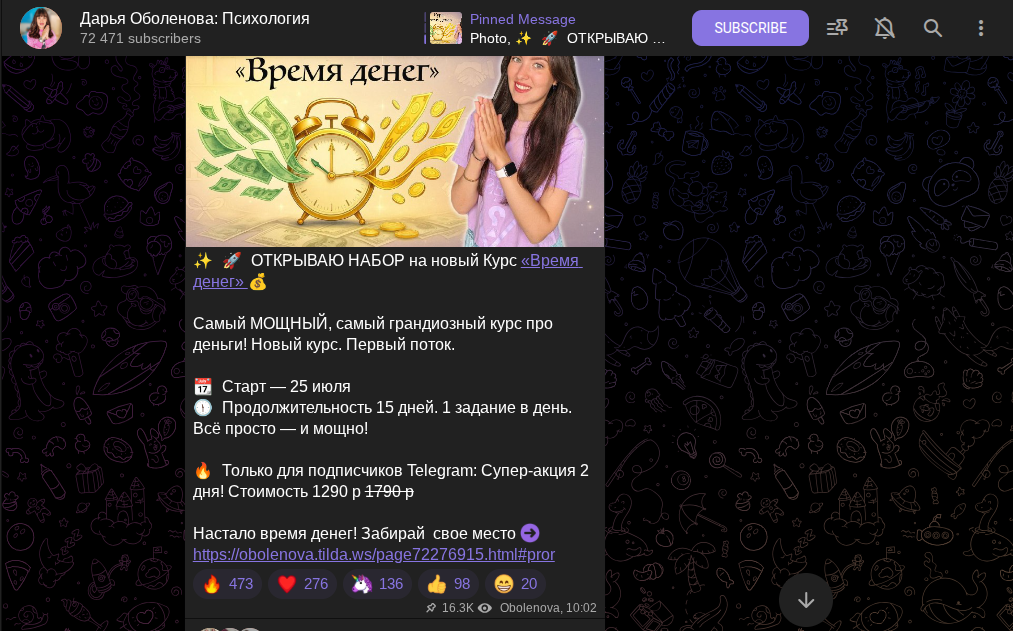 В том же телеграме есть более 15 программ, включая практики, вебинары, электронные книги, аудио-практики. Последний платный курс мы нашли за 13 июля 2025 год. Называется он «Время денег».