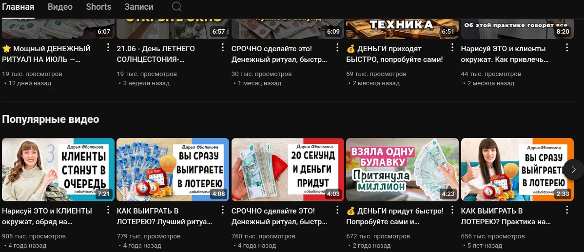 Видео на ютубе ознакомительные. Эксперт дает рекомендации по финансовым аспектам жизни на уровне ритуалов. Как видно по количеству просмотров, тематика практик на продажу квартиры, желания быстрые деньги от Дарьи Оболеновой в тренде. Однако, стоит понимать, статистику психолог не ведет, а потому невозможно подсчитать, действительно ли все это окупает себя.