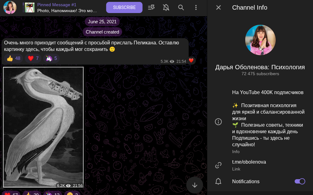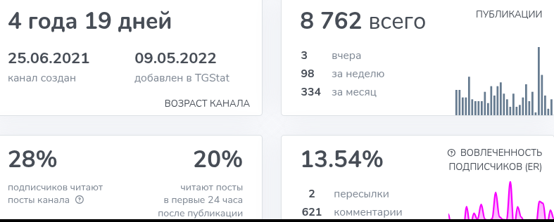 На информационное сообщество Дарьи Оболеновой в телеграме подписку оформили более 70 000 пользователей. Активность больше 10% — но только на первый взгляд. Анализ через TGStat показал, что посты читают 28%, а вовлеченность более 13%. Параметры показывают, что контент интересен аудитории.