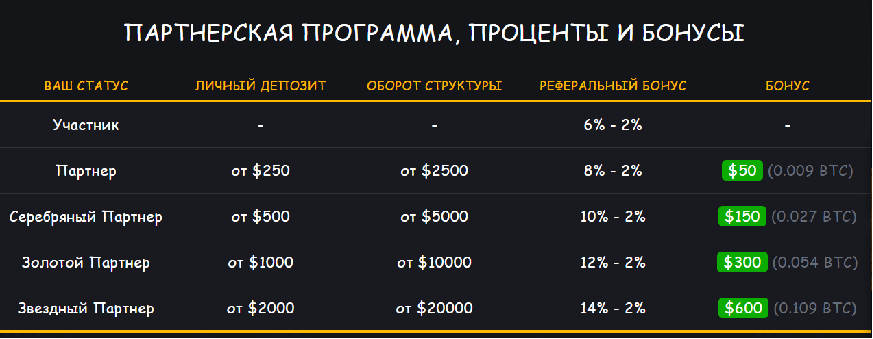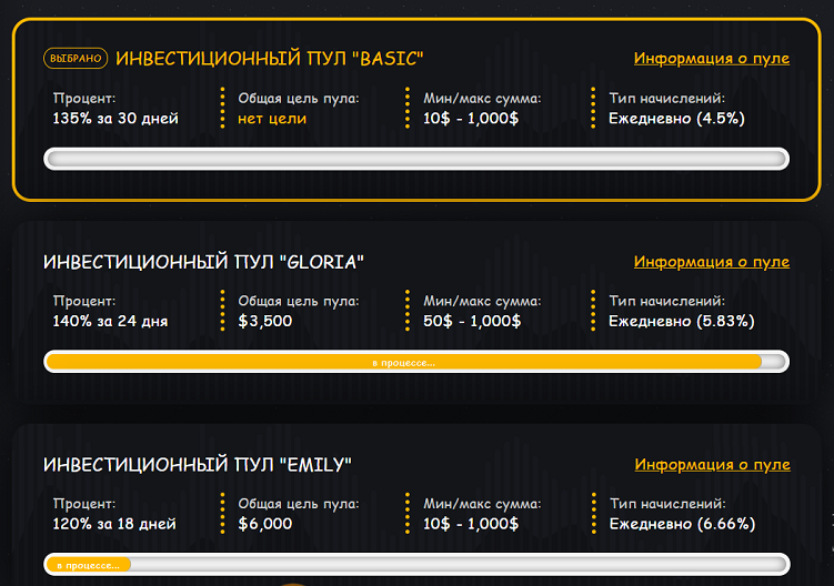На момент запуска было заявлено три тарифных плана для инвестиций. Срок от 18 до 30 дней. Гарантированные ставки в диапазоне 120-140% за один период. Или 4,5-6,66% в день по условиям вклада. Также тарифы структурированы в зависимости от суммы входа по 10-50$.Ограничен и верхний порог вклада – 1000$. Однако, такую “строгость” смягчает одно условие – вы можете открывать бесконечное количество вкладов. Вас не удивляют эти предложения? Нам кажется нереальным такой доход на инвестициях. Точнее, эта пирамидальная структура совсем далека от честных инвестиций.