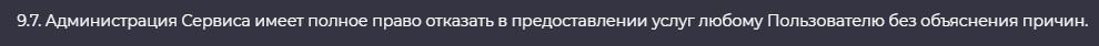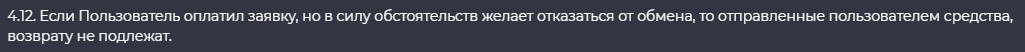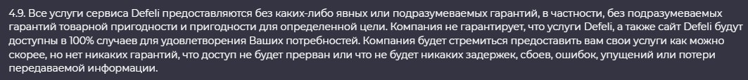 Также, согласно этому документу, владельцы ресурса снимают с себя полную ответственность за несоблюдение условий и никаких гарантий не дают.Defeli наделяет себя правом отказать пользователю в услуге обмена.
