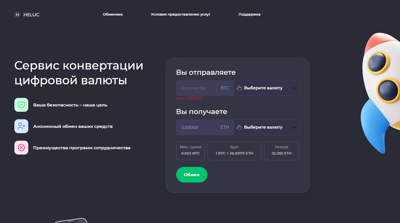 Сайт состоит из главной страницы с заявкой обмена, а также двух разделов – одна с условиями сервиса, второй – ссылка, ведущая в телеграм-мессенджер. В условиях использования сказано, что сроки выполнения операций зависят от направления обмена, но обычно осуществляются в рамках регламентированного времени. Сколько конкретно – не уточняется. Возврат средств не предусмотрен.