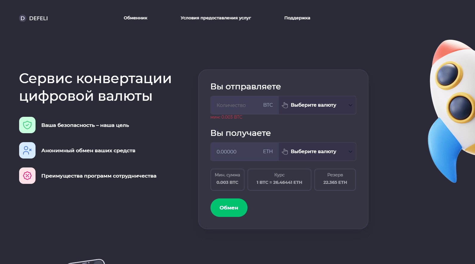 Defeli – это новый сервис, который представляет собой удобную и современную платформу для обмена цифровых валют. Defeli презентует себя как безопасный и анонимный криптообмненник с прозрачными условиями. Давайте разберемся, что предлагает нам данный сервис, проанализируем отзывы о Defeli и узнаем, какие подводные камни он скрывает.