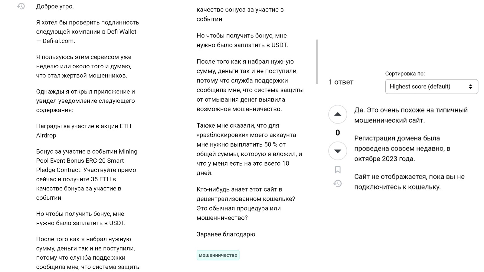На тематических ресурсах есть отрицательные отзывы о том, что у Defi Al признаки мошенничества.