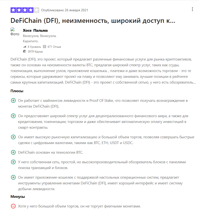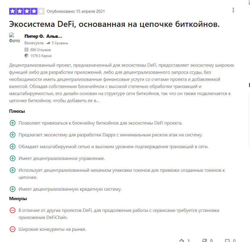 Отзывов о торговой платформе DeFiChain в сети встречается мало. В целом, люди откликаются о ней положительно, считают ее достойной, удобной и выгодной биржей. Обвинения в мошенничестве мы не увидели.
