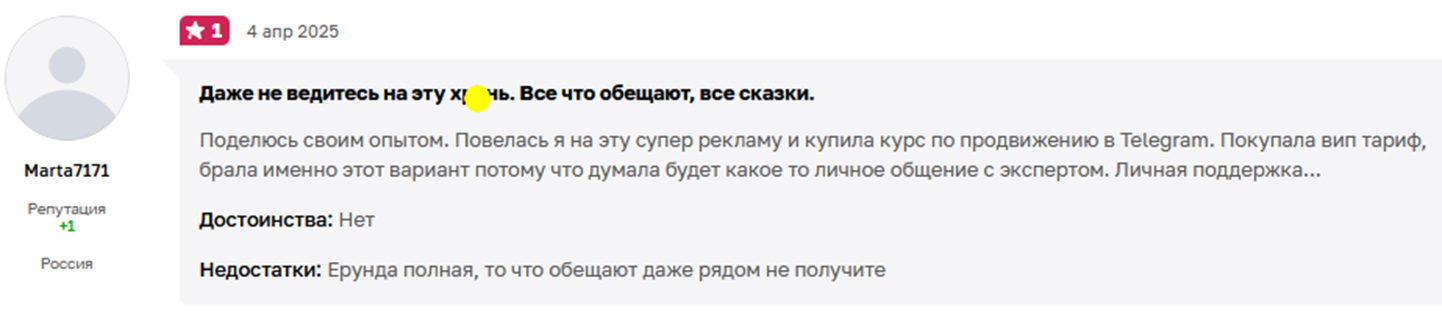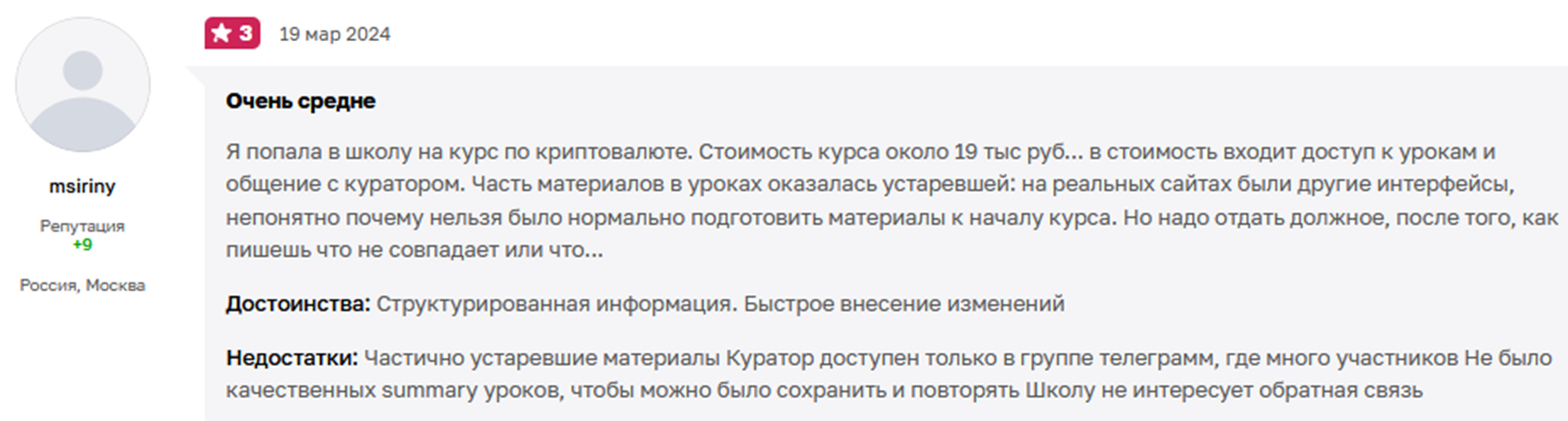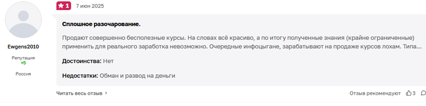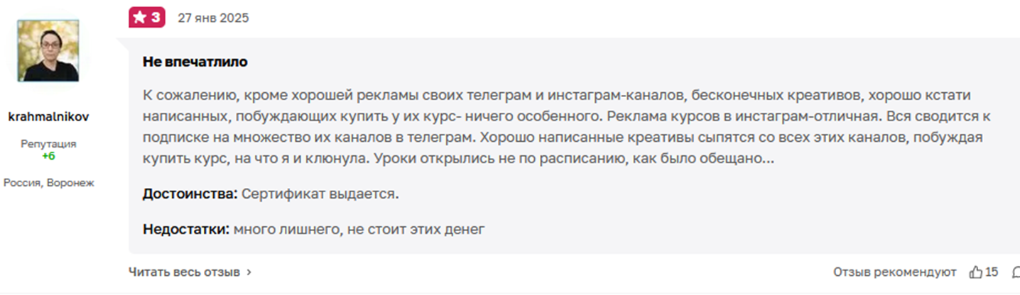 Некоторые слушатели говорят об устаревшей информации, плохой подготовке материалов. Обещанного личного общения с куратором нет, хотя многие ученики специально доплачивают за эту возможность.