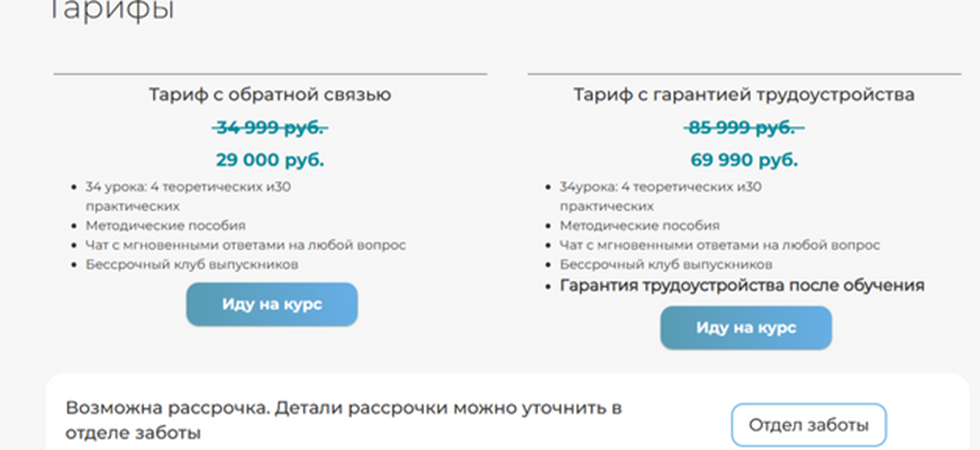Стоимость зависит от выбранного тарифа. Для плана с обратной связью цена курса начинается от 29000 рублей. Для тарифа с гарантией последующего трудоустройства стоимость повышается до 69990 рублей.