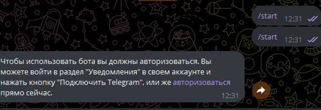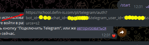 Чтобы начать работать с мини-приложением, надо нажать /start. Открывается сообщение с ссылкой перехода на личный кабинет в Школе или подключение бота через аккаунт в ТГ. Без этих действий функционал и информация о боте недоступны.