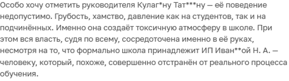 Среди найденных отрицательных отзывов есть жалобы на фактического руководителя и коуча Кулагину Татьяну. Клиенты говорят о хамском поведении, давлении на учеников.