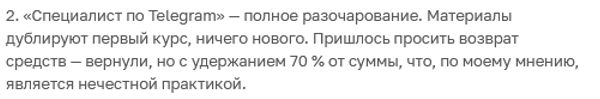По словам многих, курсы полностью бесполезные, информации, необходимой для профессиональной деятельности, нет. При требовании возврата денег за обучение перечисляют только 30%, остальное удерживают.