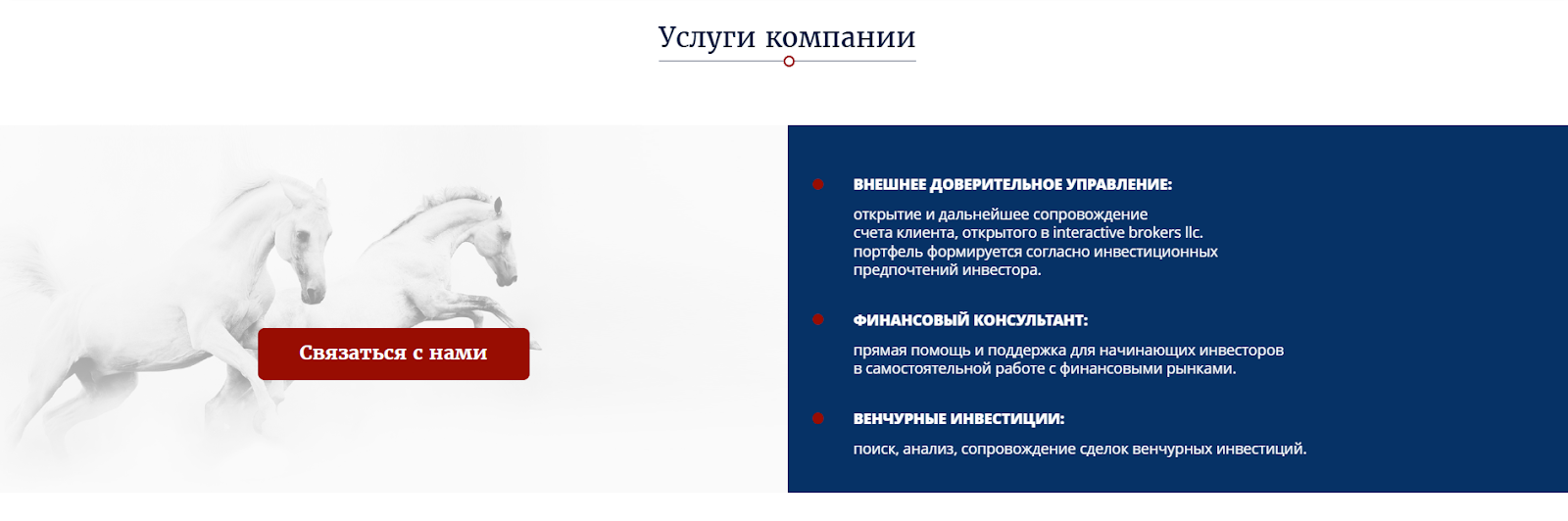 Основная услуга, которую предлагает компания Дефайн Инвест — доверительное ведение счета. Также пользователи могут получить индивидуальные стратегии и консультации.Подробной информации о том, как именно устроена работа проекта, нет. Узнать об этом можно только после предварительной консультации.
