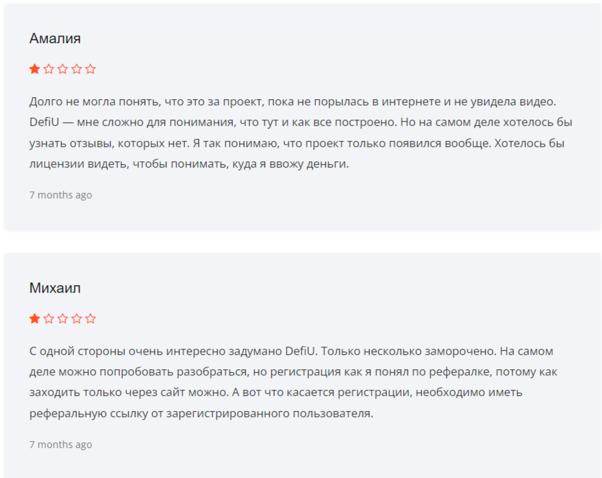 Для получения дополнительных сведений о проекте стоит почитать отзывы о Defi U com, которые оставляют клиенты. В подавляющем большинстве случаев комментарии негативные. К примеру, Амалия отмечает, что так и не смогла найти лицензию и не понимает, кому отдает деньги. Михаил жалуется, что пройти регистрацию без реферальной ссылки не удалось.