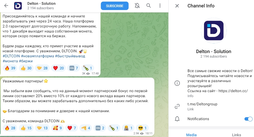 Официальный ТГ-канал Delton Solutions – это инвест новости и акции от площадки, комментарии на канале запрещены и отзывы про инвестиции с Delton от живой аудитории здесь не узнать. На 2 тыс. общей аудитории на канале приходится аналогичное количество просмотров постов. На 18 ноября компания поделилась новостями – операторами было обработано 7777 заявок на вывод средств. Правдива ли указанная статистика мы проверить не можем, однако отзывы о площадке делтон сс однозначно покажут, держит ли инвестиционная компания свои обещания.