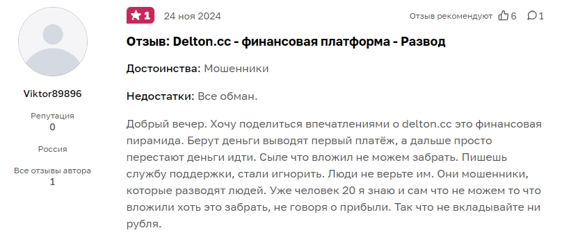 Делтон инвестиции в криптовалюту – пирамида и обман. Если Вы также стали жертвой данных мошенников – поделитесь своей историей в комментариях к обзору и предупредите других от обмана.