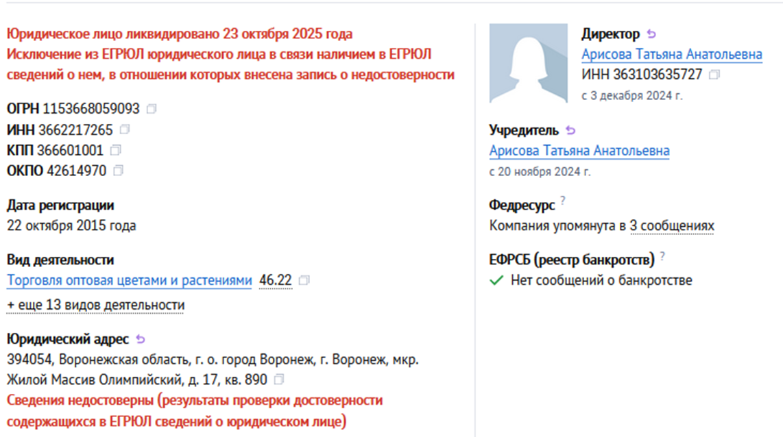 В соответствии с информацией из реестров компания была зарегистрирована в Воронеже на Арисову Татьяну Анатольевну. Сфера деятельности – торговля цветами. О самой платежной системе с названием SparkleWallet ничего не известно. Можно сделать вывод, что сайт был намеренно создан под бота с целью хищения средств.