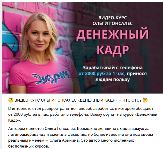 В свободном доступе на всевозможных сомнительных ресурсах Ольга продает видеокурсы «Денежный кадр» и «Денежная Волна». В рамках этих проектов автор обещает покупателям стабильный доход от 2 000 рублей в час и от 50 000 рублей в месяц. Для покупки курсов на сторонних ресурсах следует воспользоваться режимом инкогнито. В противном случае заветная кнопка «Получить доступ» и форма оплаты не появятся.