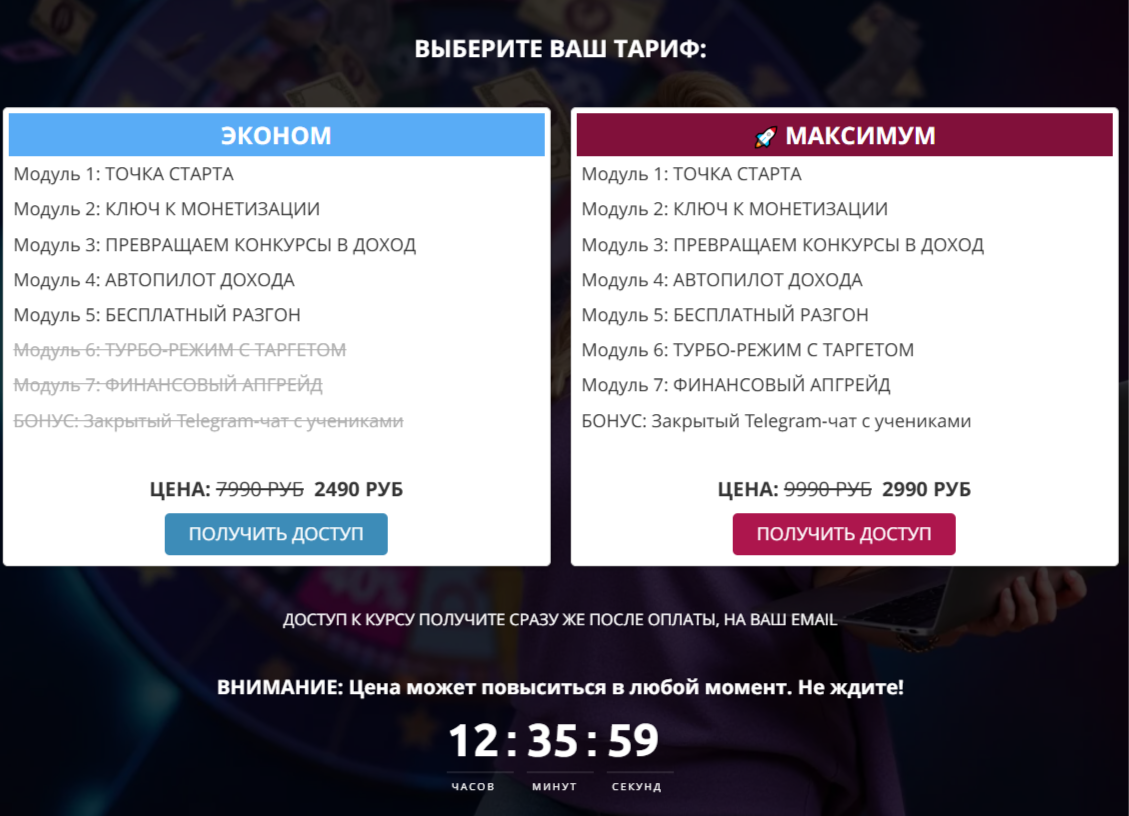 Курс «Денежная Волна» не предоставляется пользователям бесплатно. Его можно купить в двух вариантах: «Эконом» и «Максимум». Первый тарифный план на момент обзора стоит 2 490 рублей. Второй – 2 990 рублей. Автор утверждает, что цена на обучающую программу может в любой момент измениться. В рамках тарифа «Максимум» пользователи получают: