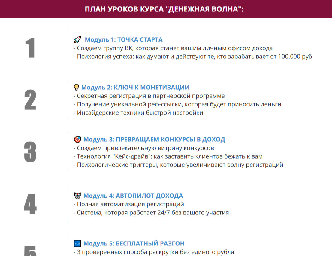 Видеокурс эксперта с сомнительной репутацией предназначен для всех желающих получать пассивный доход. В рамках этой программы тренер обещает ученикам от 50 000 рублей пассивного дохода на ВК-конкурсах. Для этого достаточно посещать социальную сеть 2-3 часа в неделю. Курс «Денежная Волна» включает 7 модулей. В процессе обучения человек получает личную группу в ВК, секретную регистрацию в партнерке, привлекательную витрину конкурсов, проверенные способы раскрутки и т. п.