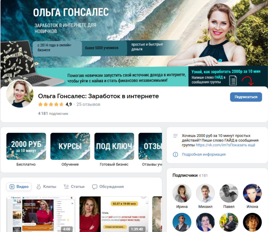 Курс для будущих богачей предлагает целевой аудитории некая Ольга Гонсалес. Барышня считает себя настоящим экспертом по онлайн-заработку. Рассказывает о том, что занимается успешным бизнесом в интернете на протяжение 11 лет. Является счастливой матерью двоих детей и женой кубинца. Своим потенциальным клиентам Ольга предлагает различные обучающие программы. На личной странице мошенницы в ВК можно обнаружить ее деловые предложения: