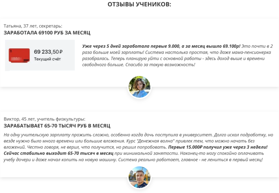 «Денежная Волна» – очередной бесполезный для пользователей мошеннический проект. У данной обучающей программы априори нет достоинств, как и у ее создательницы. Минусы: