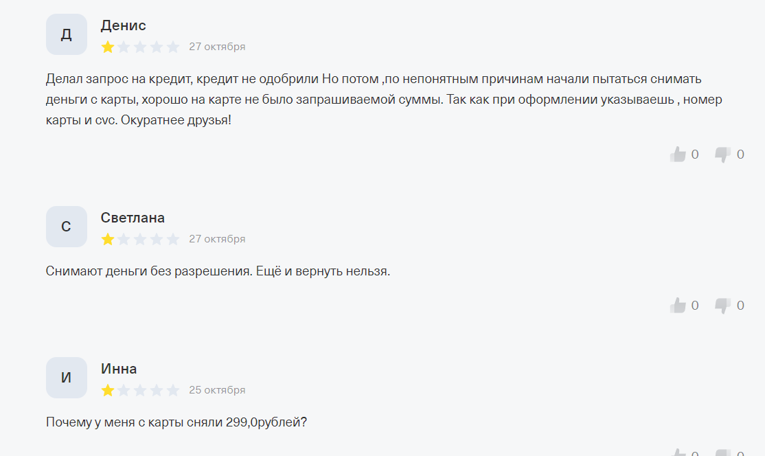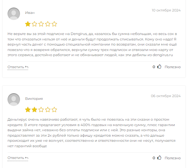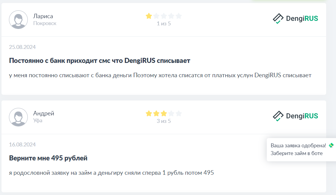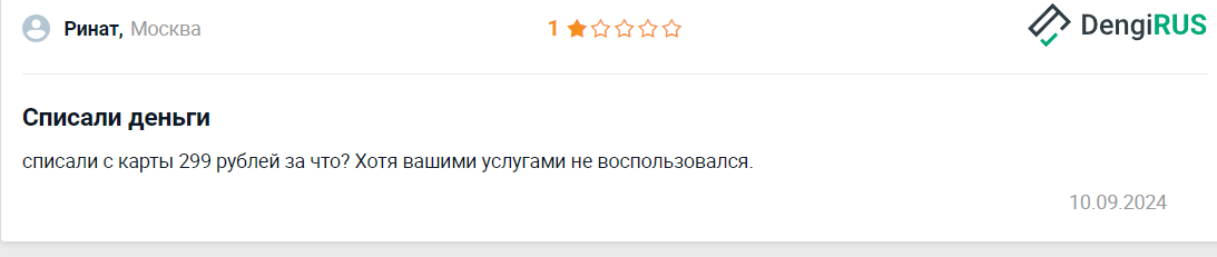 Dengirus списывает с карты клиента после отказа в кредите небольшие суммы, но делает это регулярно, в связи с чем имеет много негативных комментариев на разных платформах. Редакция не рекомендует работу с Деньги Рус, это скам.