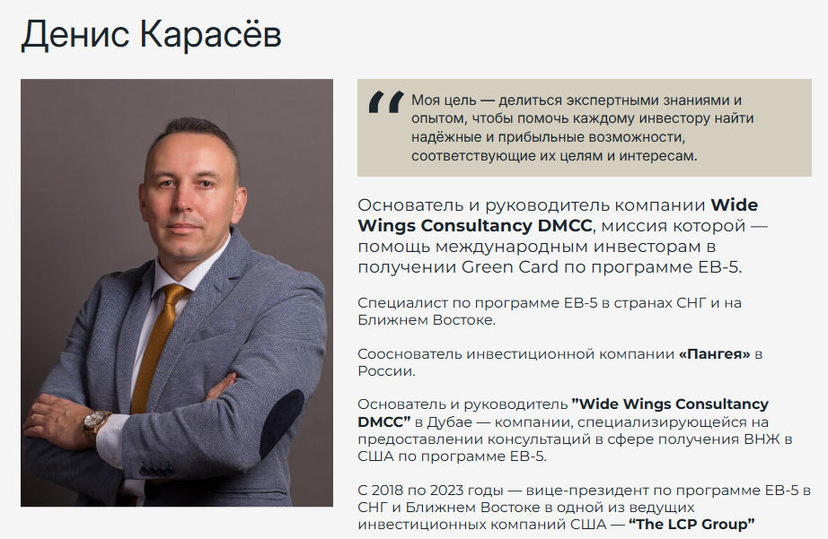 Денис Карасев на портале Widewingsdmcc com продвигает программу ЕВ-5, разработанную администрацией США. Суть программы – за определенные инвестиции в американскую экономику вкладчики получают статус постоянных резидентов США.