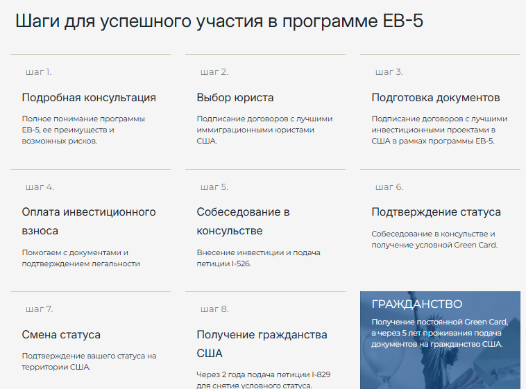- обязательное условие – подтверждение законности капитала, сохранение и создание по меньшей мере 10 рабочих мест для американских граждан;