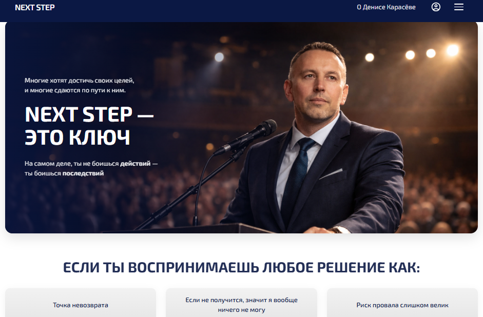 - на ресурсе Dkarasyov com Денис презентует свой курс Next step для тех, кто хочет достичь своих целей. Курс состоит из 13 модулей и включает такие тематики как дисциплина, оценка шага, зона реального влияния, разбора страхов и тревожных состояний, и так далее.