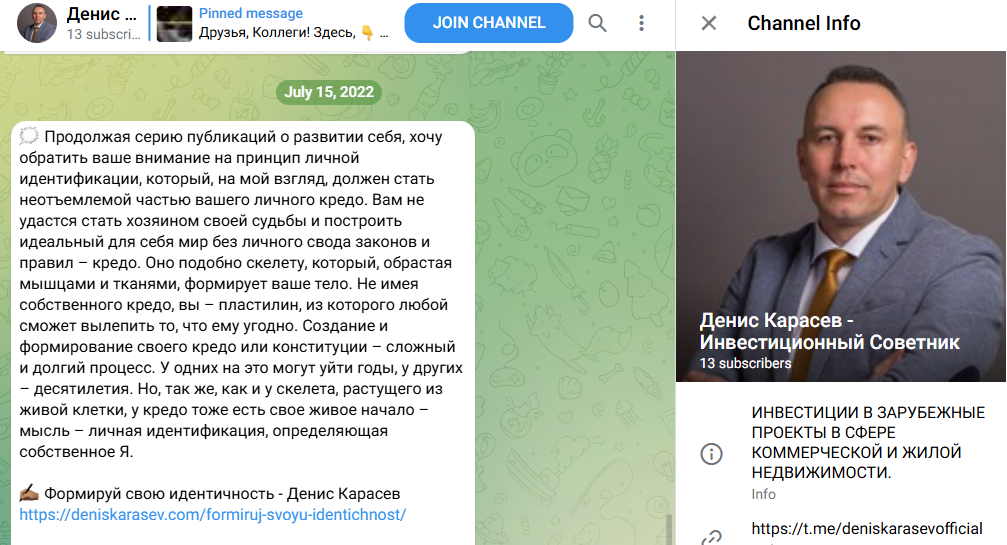Свое Telegram сообщество Deniskarasevofficial Денис забросил в 2023 году. Контент автора был посвящен саморазвитию, вышеупомянутой американской программе и релевантным новостям, а также личным записям.