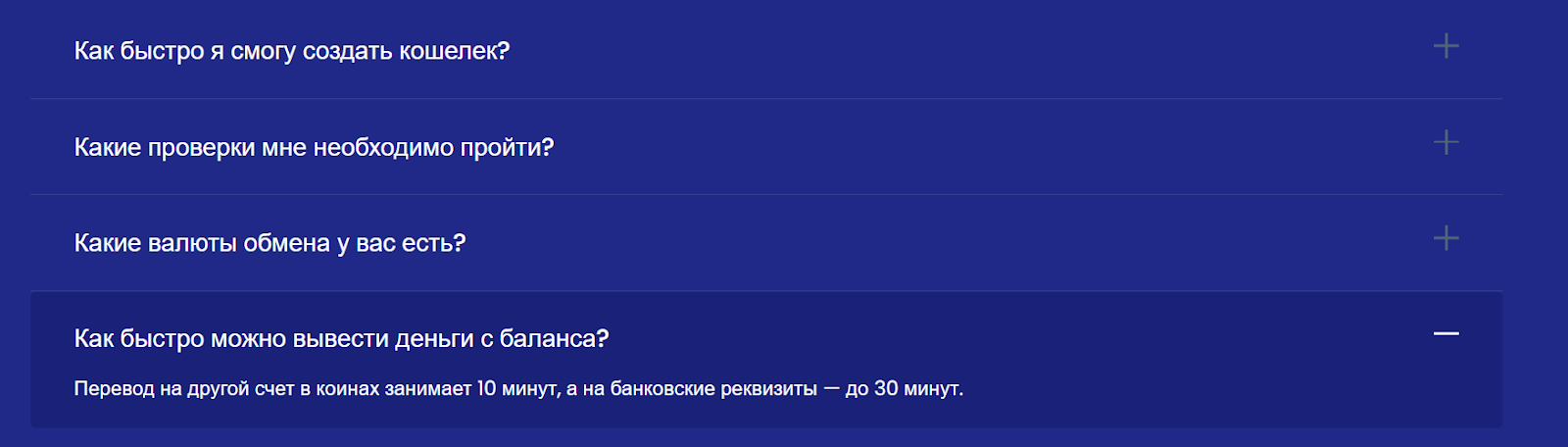 В описании разработчики заявляют, что среднее время проведения сделки не превышает 15 минут. При этом не обойтись без проверки AML и KYC. Что касается поддерживаемых валют, их количество ограничено и составляет около 130. В дальнейшем по желанию можно вывести деньги со счета в течение 10 минут при оплате в крипте. В случае с банковскими реквизитами средства зачисляются до 30 минут.