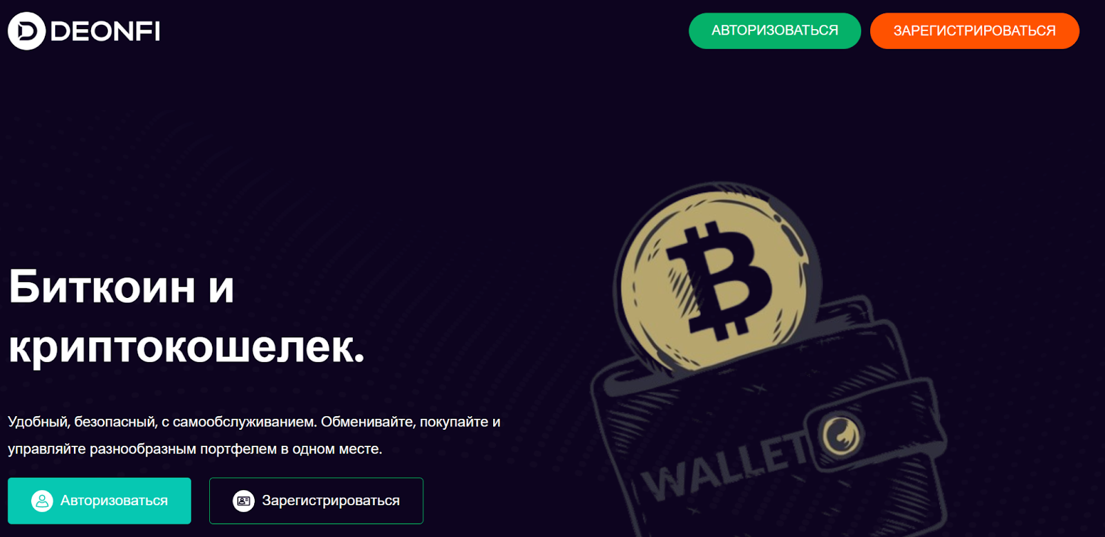 Рассматриваемый ресурс предоставляет услуги по ссылке DeonFI com. После входа клиентам сразу предлагают пройти регистрацию. При этом описываются плюсы криптокошелька, которые заключаются в удобстве и безопасности. Пользователям заявляют, что они смогут проводить обмен, покупку и управление монетами.