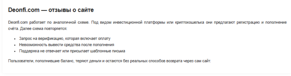 В интернете можно найти десятки плохих отзывов о DeonFI com. Пользователи рассказывают, что платформа предлагает регистрацию и обязательную верификацию. После пополнения счета клиенты уже не могут вывести деньги. При этом служба поддержки игнорирует запросы или присылает обычные отписки.