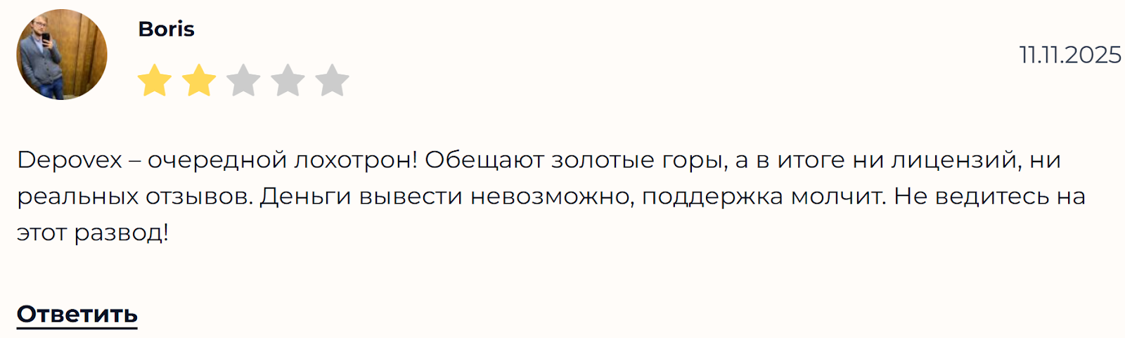 Инвесторы жалуются на заморозку аккаунтов, исчезновение поддержки и требование «верификационного депозита» перед выводом средств. В некоторых случаях после оплаты дополнительных комиссий доступ к кабинету полностью блокировался. На форумах и крипто-площадках упоминаются аналогичные сайты с тем же дизайном и структурой, что указывает на возможную принадлежность Depovex к сетке скам-бирж.