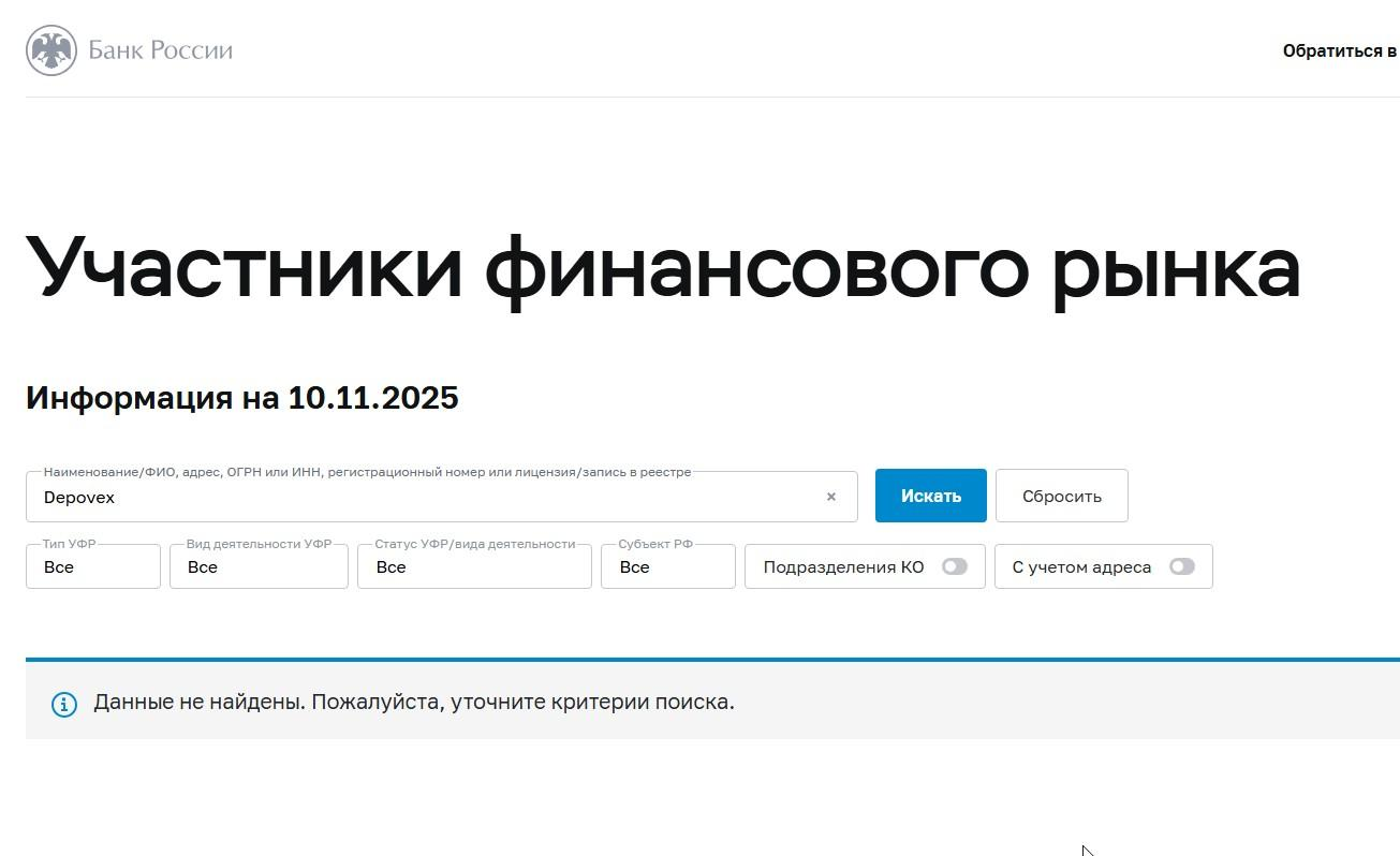 В разделе Regulatory на сайте depovex com перечислены формальные фразы о соответствии требованиям международного законодательства, но без каких-либо документов. Независимые базы не содержат записей о компании, а в WHOIS данные владельца скрыты. Таким образом, Деповекс – это анонимный офшорный проект без лицензии, гарантий и регулирующего органа.