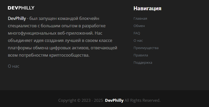 Изучая портал, мы ознакомились с внутренними документами, но не нашли там сведений о юридическом лице. Вероятно, обменник DevPhilly не зарегистрирован как компания, что повышает риски при сотрудничестве.