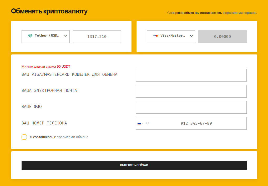 Форма для обмена валют представлена на главной странице сайта, зарегистрироваться для отправки запроса не обязательно. Пользователю нужно выбрать пару, указать сумму, адрес почты и номер телефона.