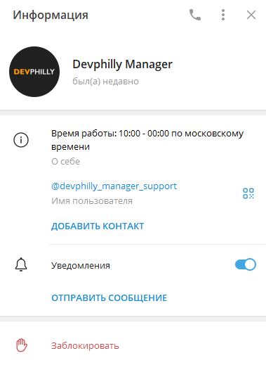 Аккаунт Devphilly Manager работает с 10:00 до 00:00 по московскому времени.
