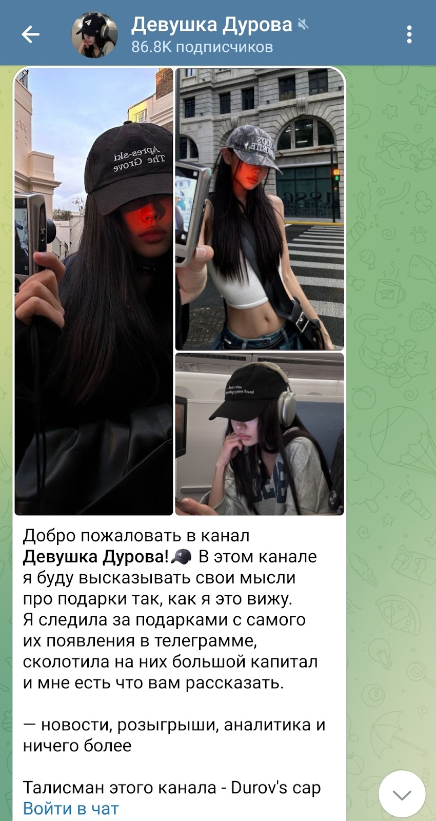 Телеграмм канал Dur0vka появился в мессенджере недавно. Первый пост был опубликован 20 апреля 2025 года. В нем девушка-администратор рассказывает, что имеет большой опыт инвестирования, следит за телеграмм-подарками с самого их появления и сумела сколотить на них целое состояние. Своим опытом и знаниями блогерша хочет поделиться с подписчиками.