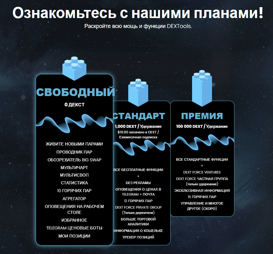 У биржи Dex Tools io есть несколько тарифных планов. Они позволяют получить доступ к различным сервисам, функция и инструментам. В наличии бесплатный тариф.