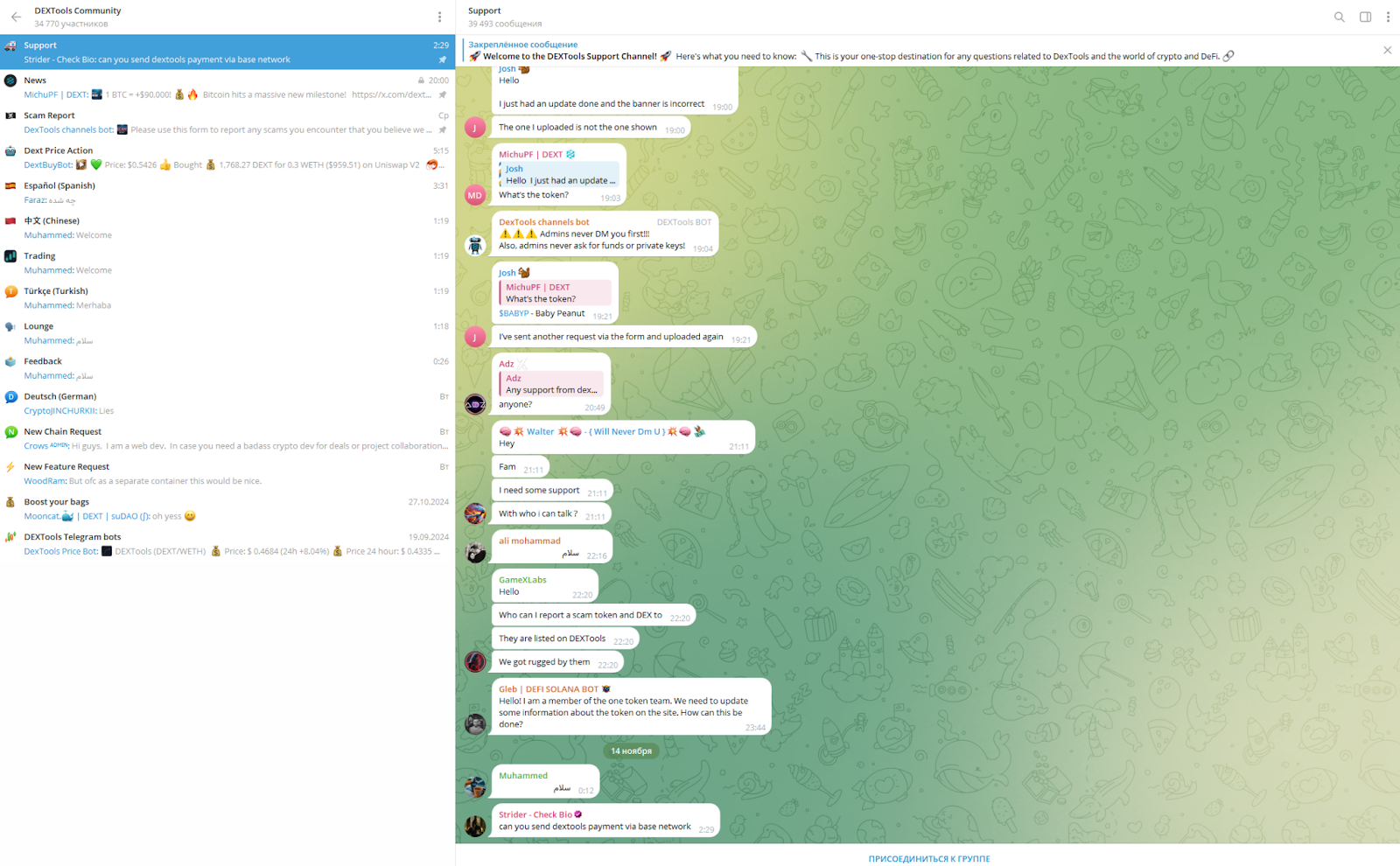 Телеграмм-канал Dextools Community имеет ник Dextoolscommunity. Число подписчиков более 34 тысяч. По сути, это чат сообщества с несколькими ветками. Общение ведется на английском языке, есть ветка службы поддержки.