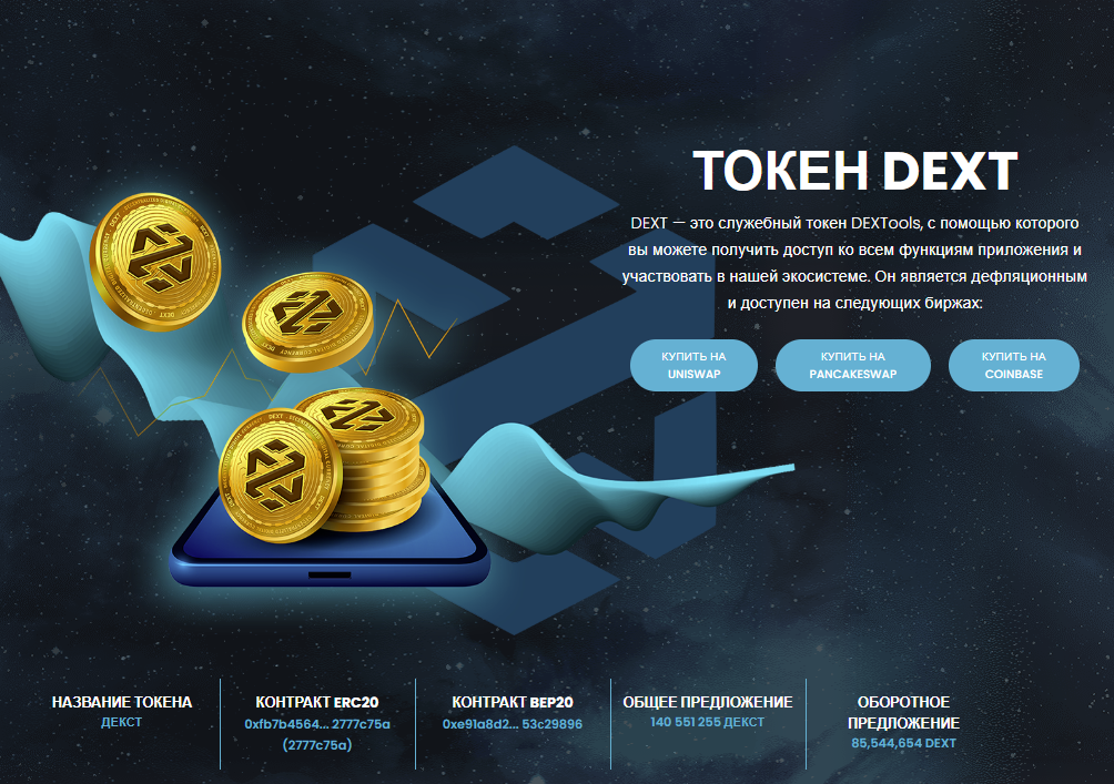 У проекта имеется мобильное приложения для iOS и Android. Есть и токен Dextools ton под названием Dext. Он позволяет получить доступ ко всем функциям приложения, участвовать в экосистеме. Его можно купить на нескольких криптобиржах, информация указана на изображении ниже.